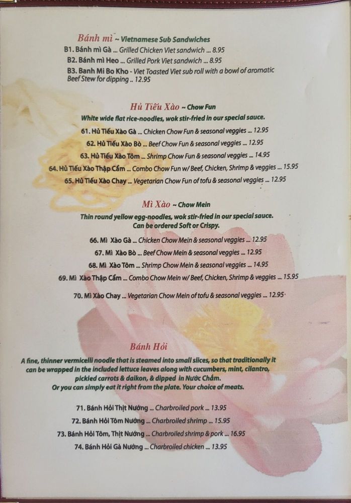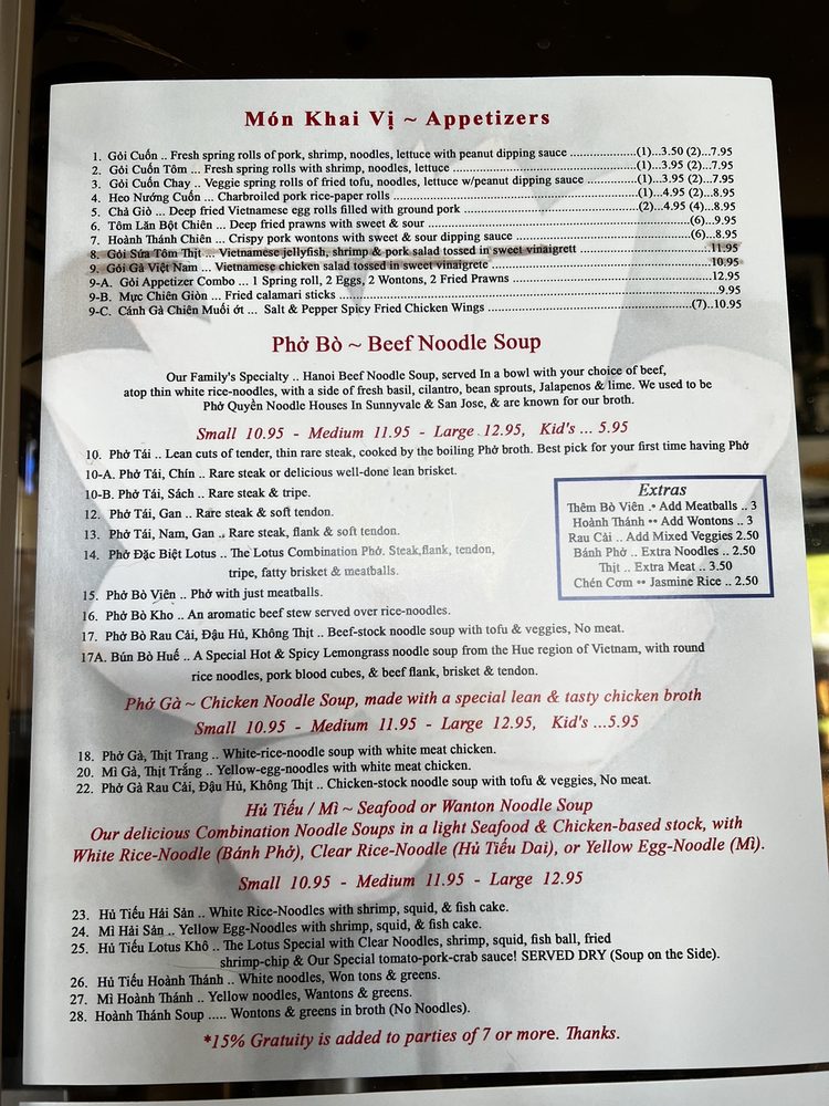 Pho Lotus Vietnamese Restaurant Menu